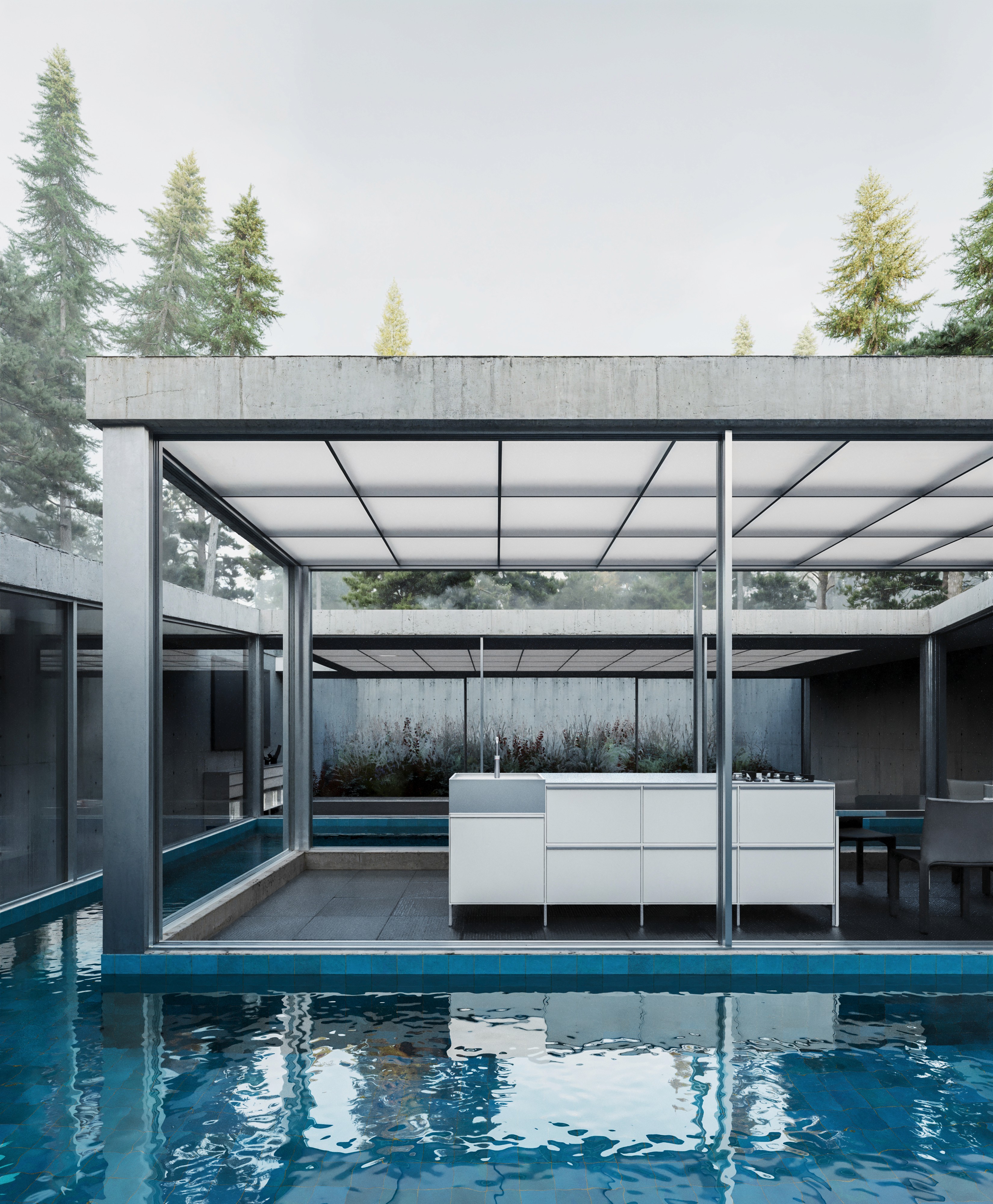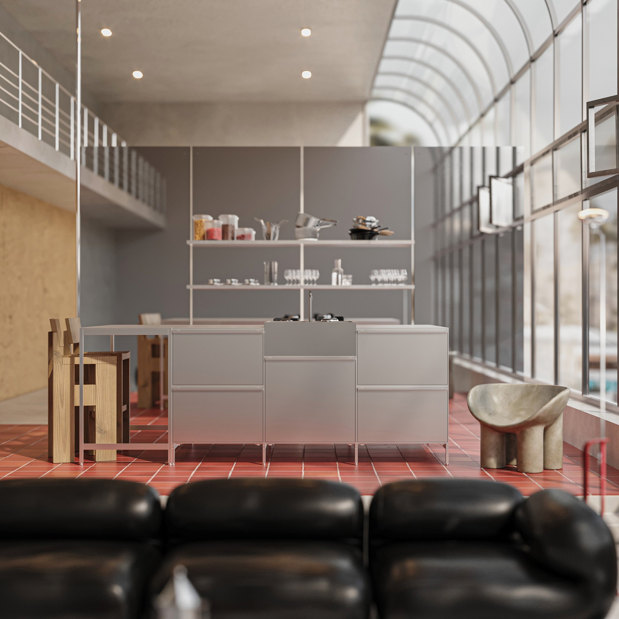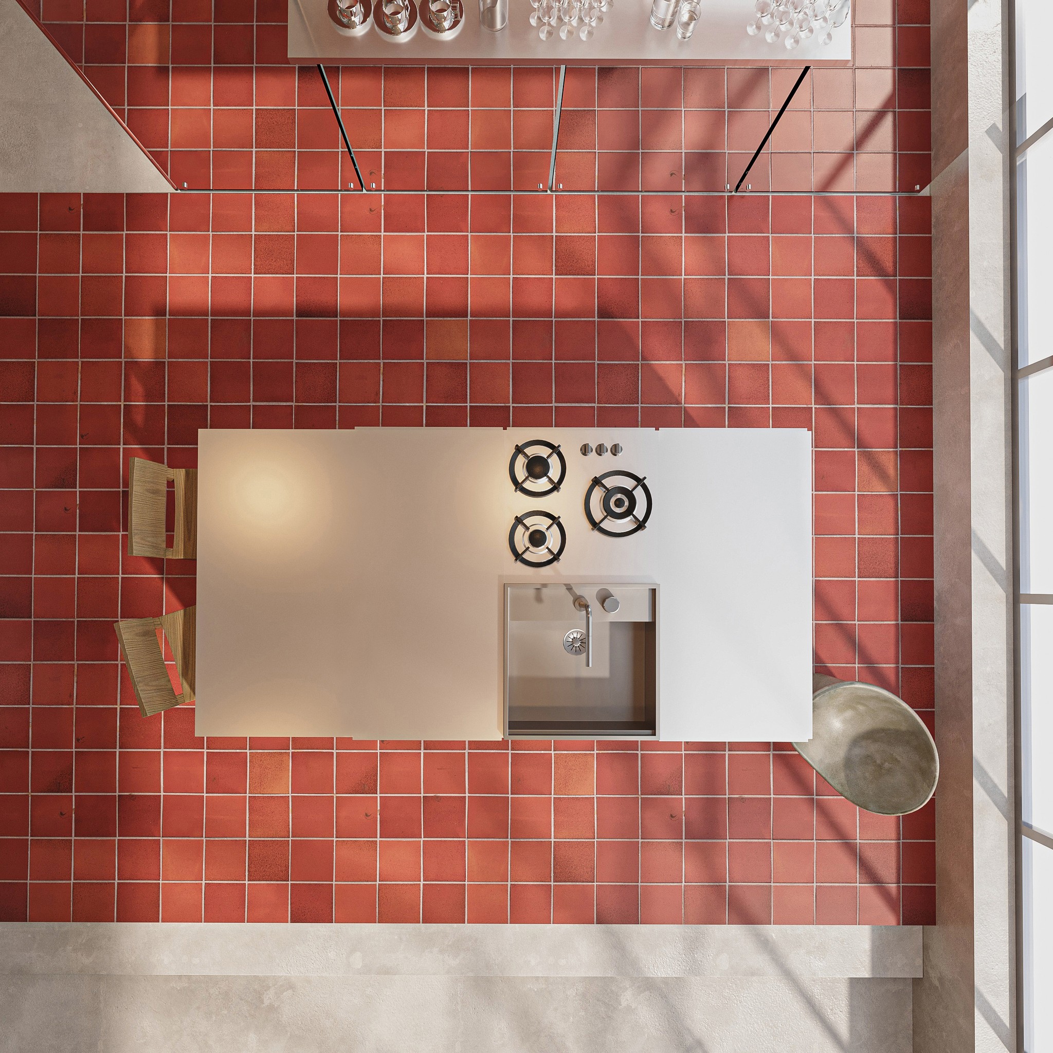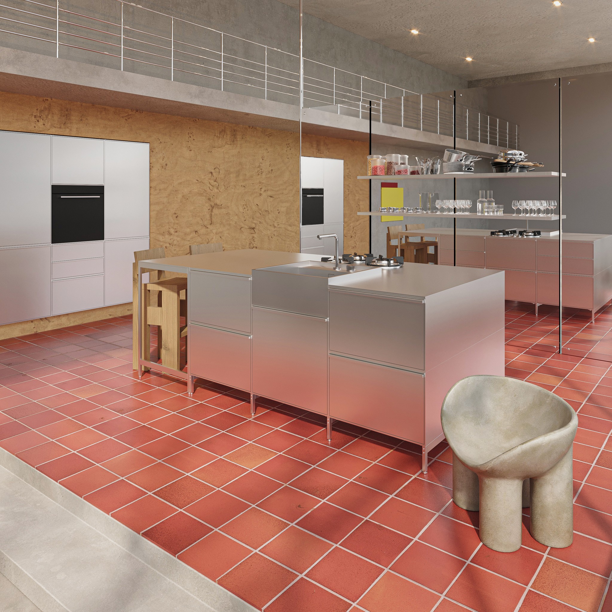 The mirrored wall in the kitchen reflects that natural light, making the room feel even more expansive, while the balance of materials—from raw concrete to metal, wood, and the blood red tiles—creates a sophisticated yet cosy environment.