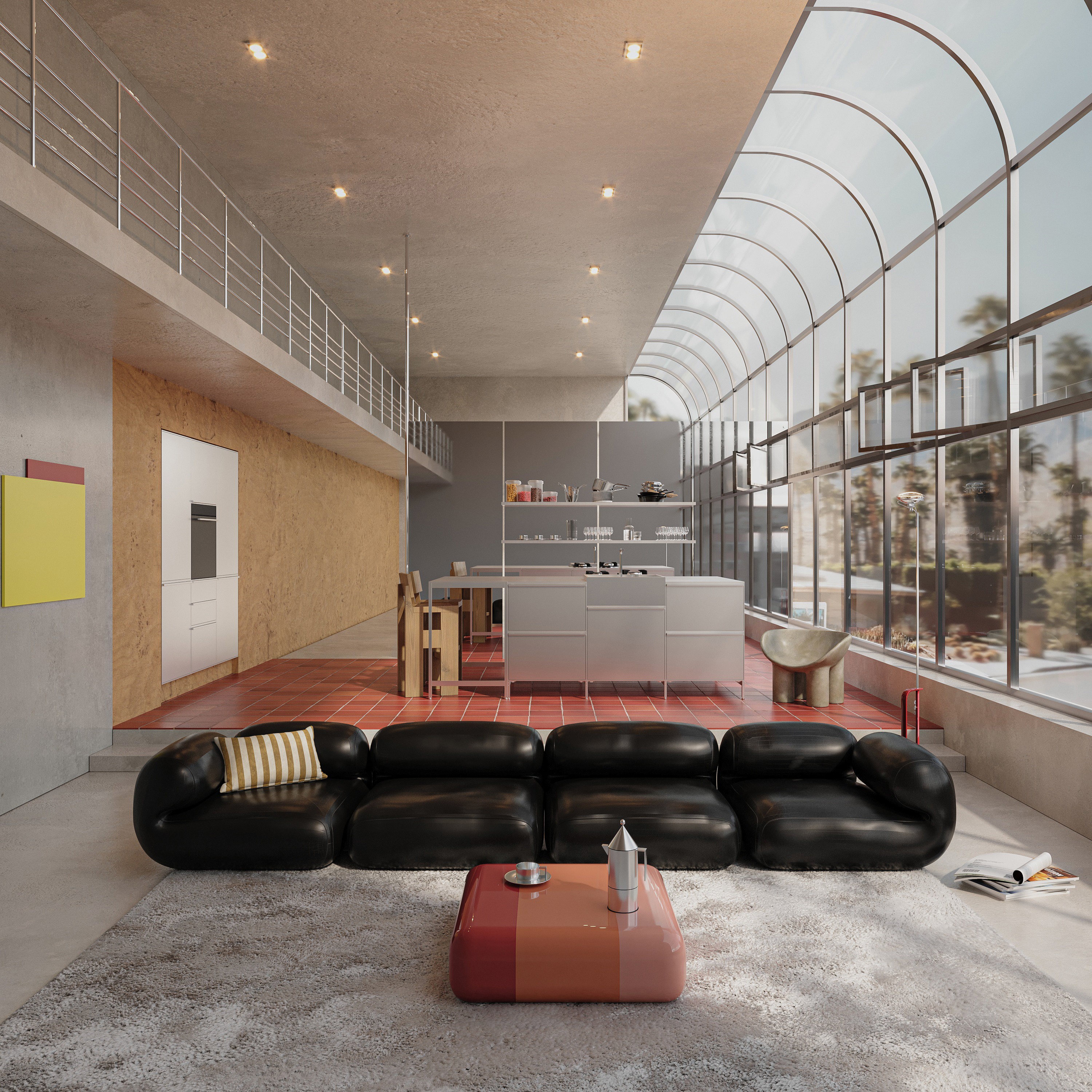 What sets the space apart is its architectural openness. A mezzanine balcony floats above the kitchen-living area, further enhancing the airy, light-filled atmosphere created by the floor-to-ceiling windows that allow natural sunlight to flood in.