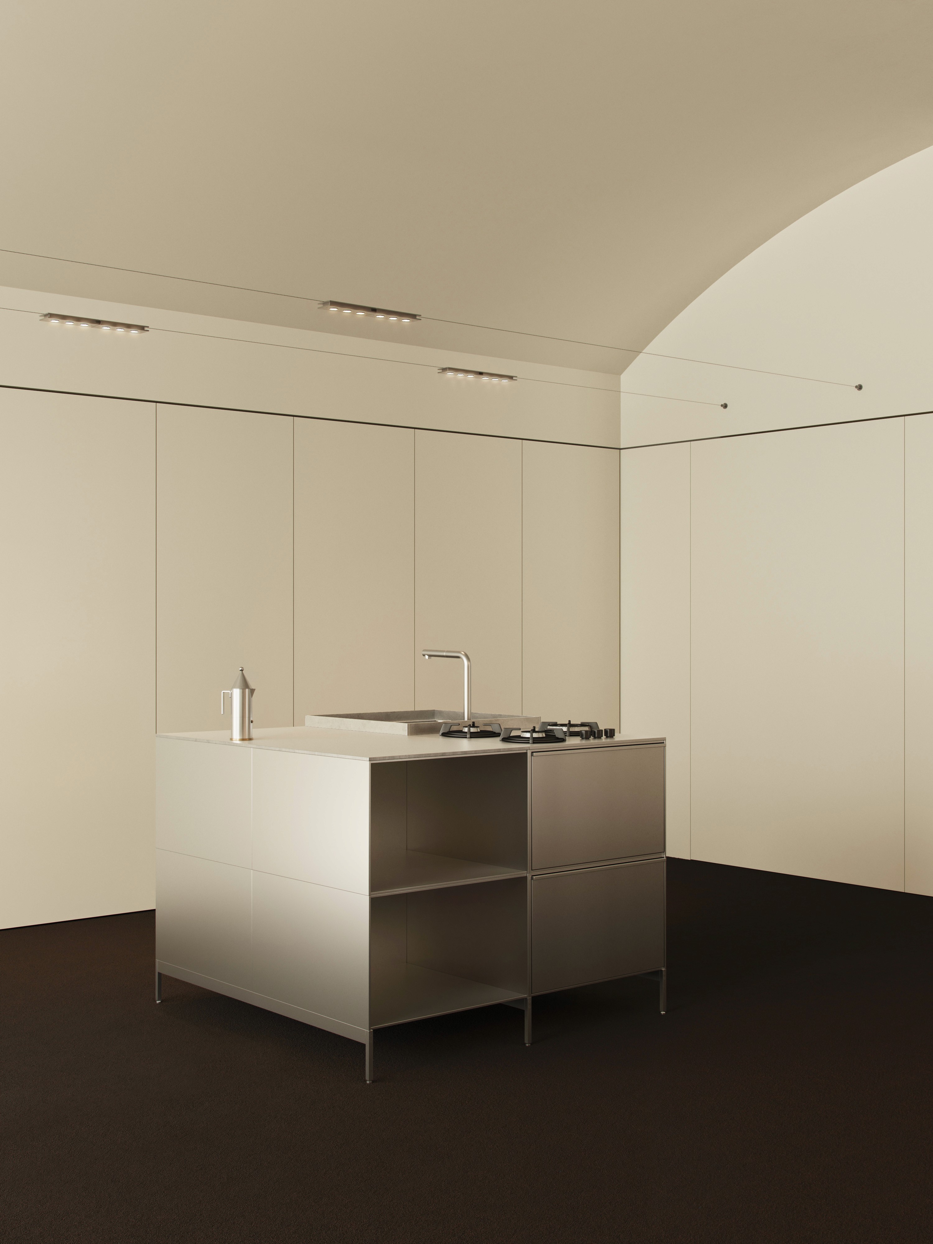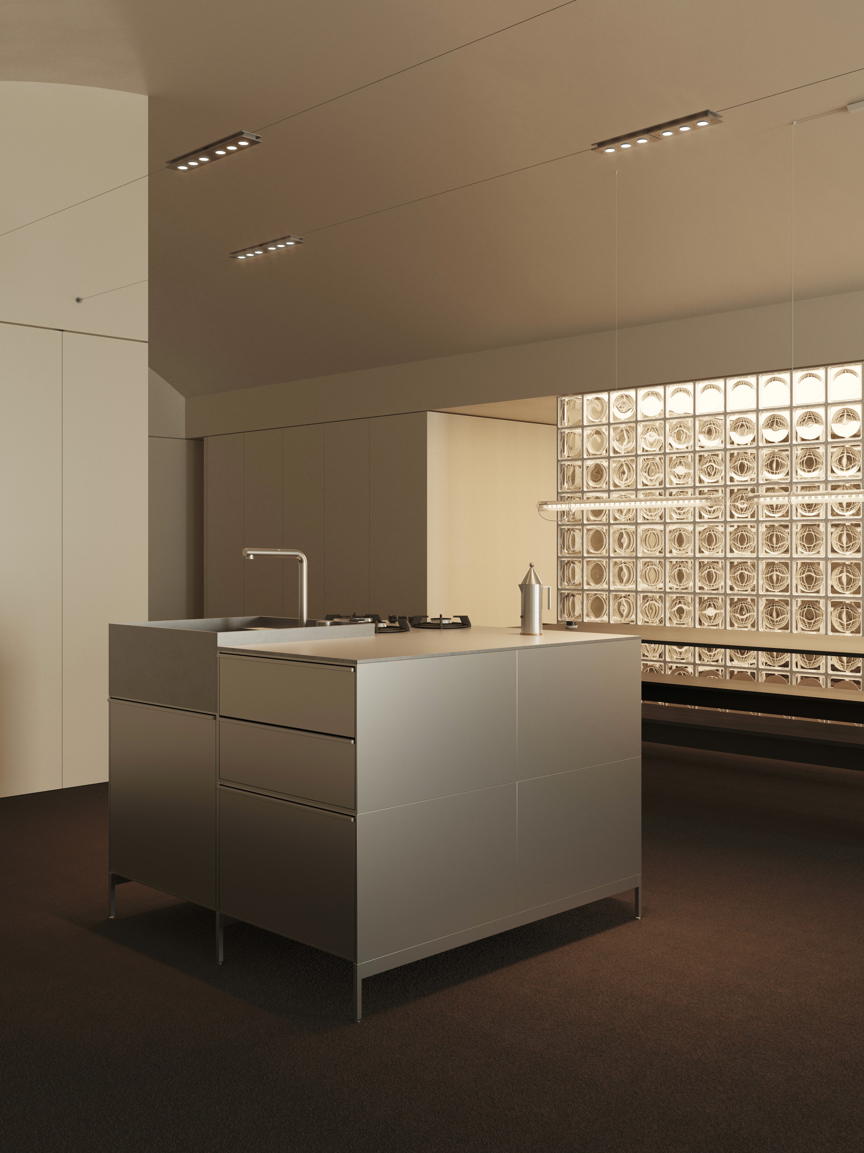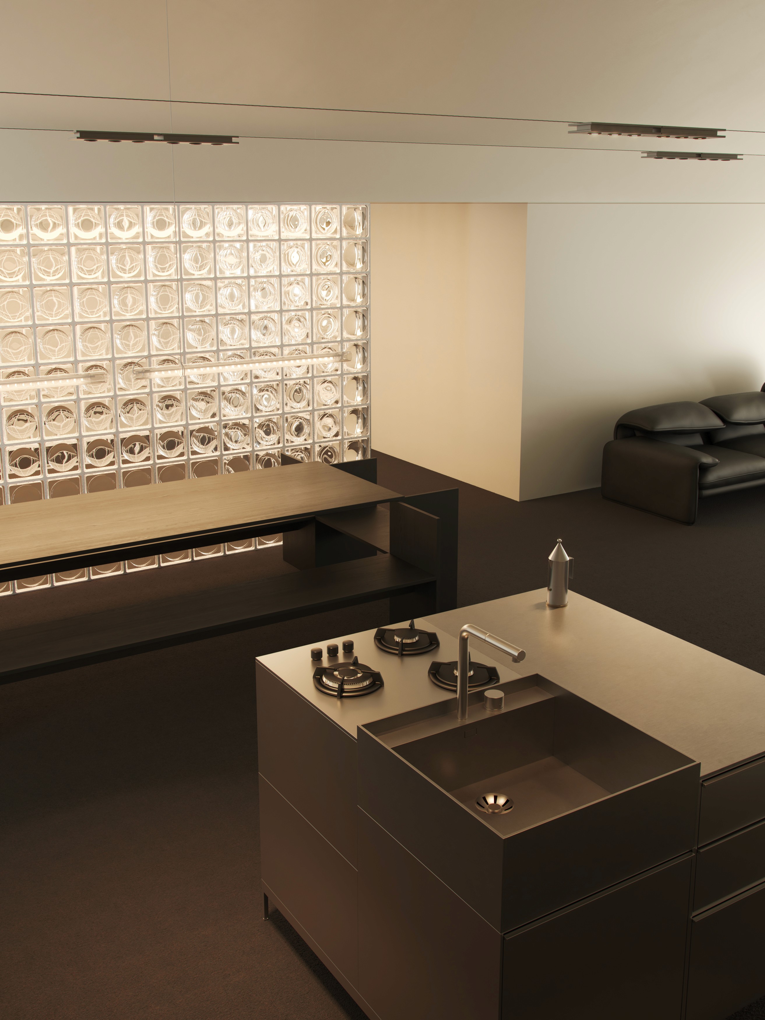 Our approach to the kitchen always depends on the project. In this case, we understood from the beginning that it would take on a certain presence, functioning as a freestanding element rather than being embedded into the architecture. In that sense, it operates more as an anchor within the space, not by dominating it, but by establishing a clear point of reference within a largely continuous environment. The intention was not to dissolve it completely, but neither to treat it as an isolated object. Instead, it sits in a subtle balance between autonomy and integration. At that point, we started wondering: what if its material definition could reinforce this condition, allowing it to be perceived as a distinct piece while still participating in the overall spatial continuity? This ambiguity was important for us, as it avoids a hierarchical reading and allows the kitchen to engage with the space in a more open and flexible way.