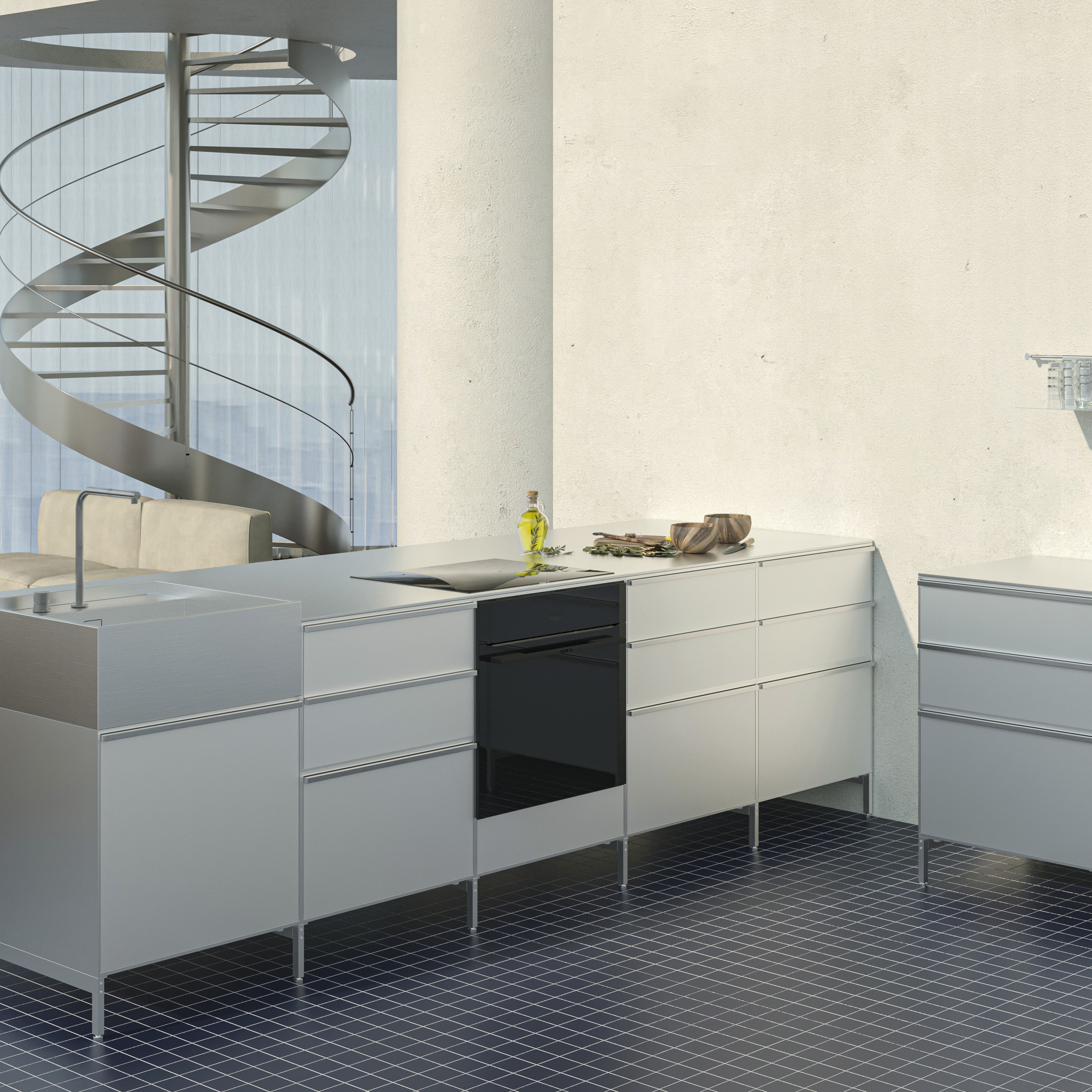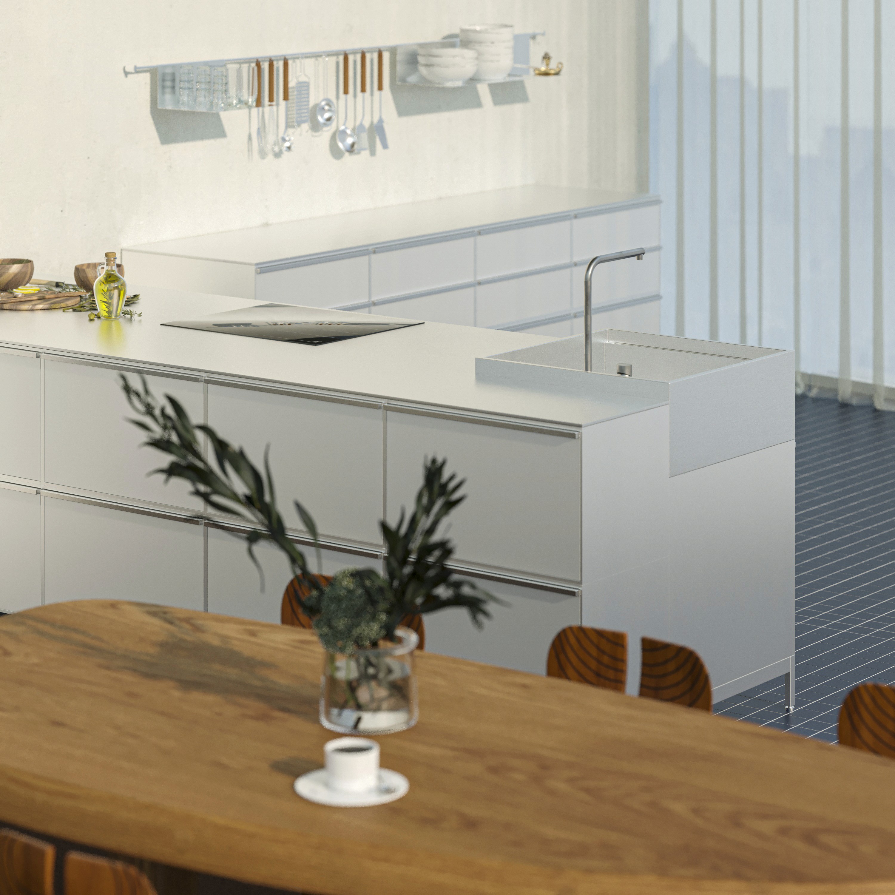 TERMINO modules are used throughout—not as statements, but as part of the architecture. A kitchen island sits on a deep blue tiled grid, flanked by seamless storage walls in the same brushed Aluminium finish. The modules extend quietly into the living and sleeping zones, where they take on new roles: a media console here, a bedside table there. There’s no visual hierarchy—no insistence that any one piece is the focal point. Instead, they fold into the rhythms of the space.