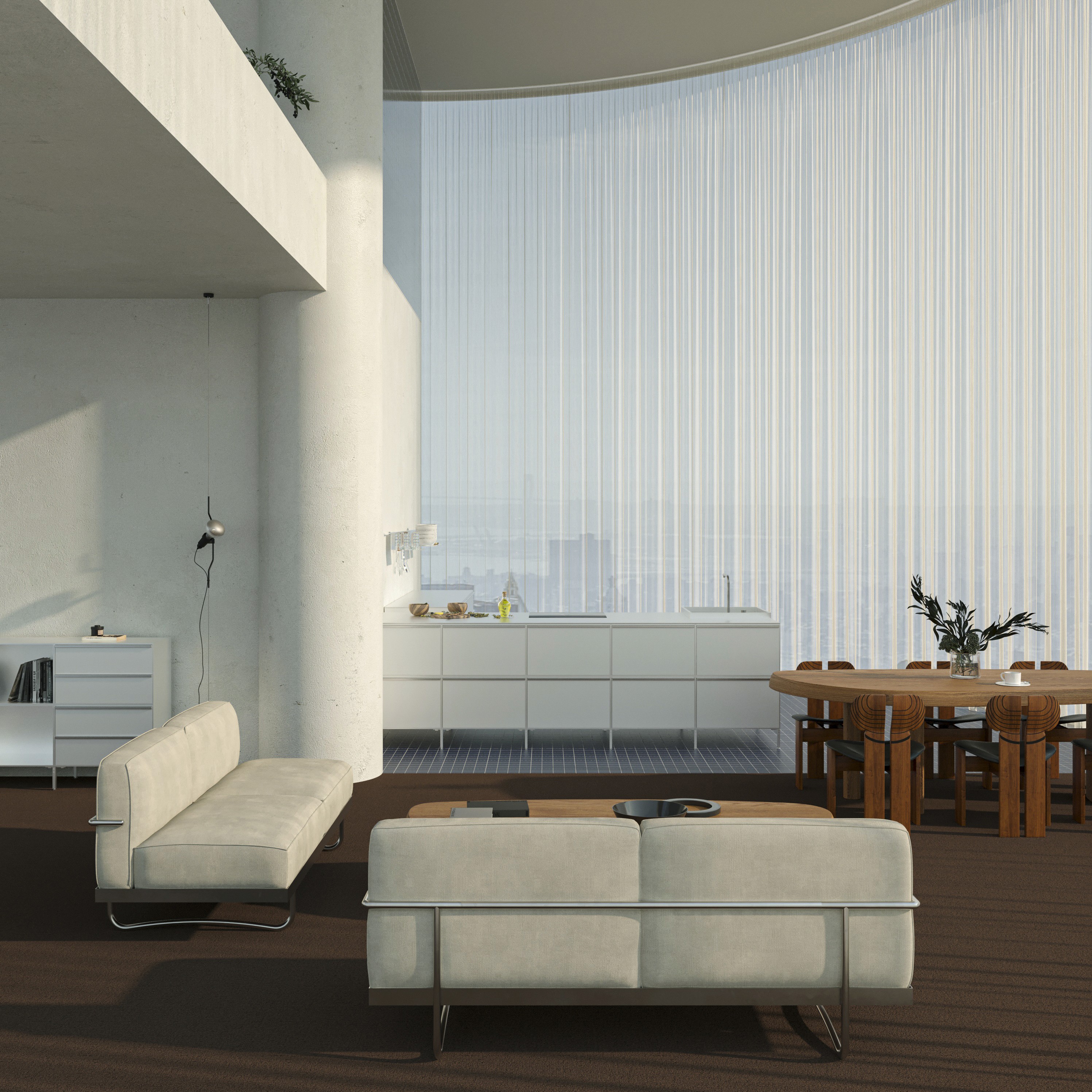 That rhythm is slow and deliberate. Light moves through the loft gradually, casting long lines and soft shadows across the floor. The materials pick up on this stillness—earth-toned carpet underfoot, pale render on the walls, matte oak furniture anchoring the room. The dining table, heavy and low-slung, acts as a kind of centrepiece. Not decorative, but deeply present. It's the kind of furniture that makes you want to sit a little longer than planned.