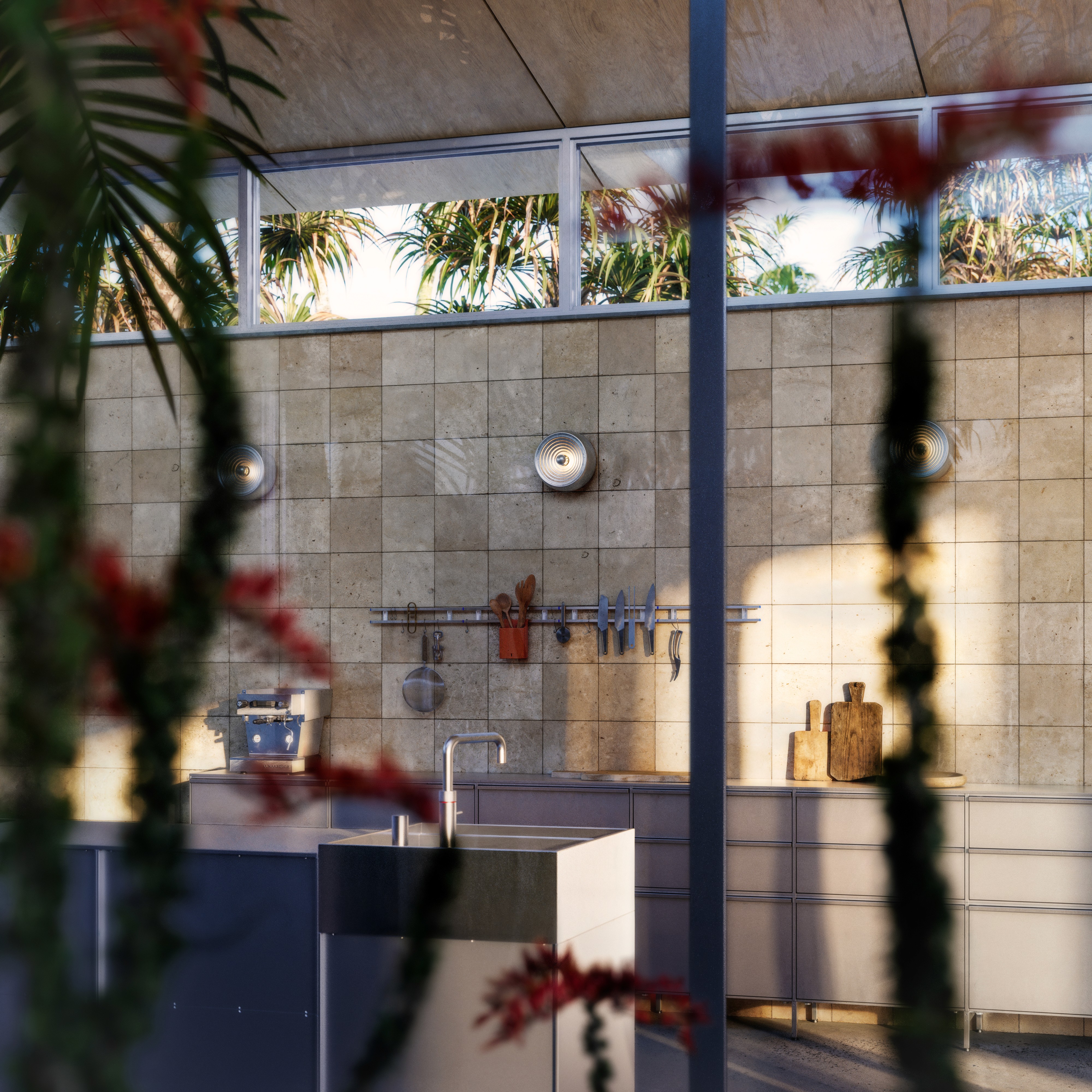 "As the sun sets and the evening light glows golden, the space really comes to life. An ecosystem of materials forms where the TERMINO modules act as a prism, scattering the rays atop the concrete floors, wooden ceiling panels and tiled walls."