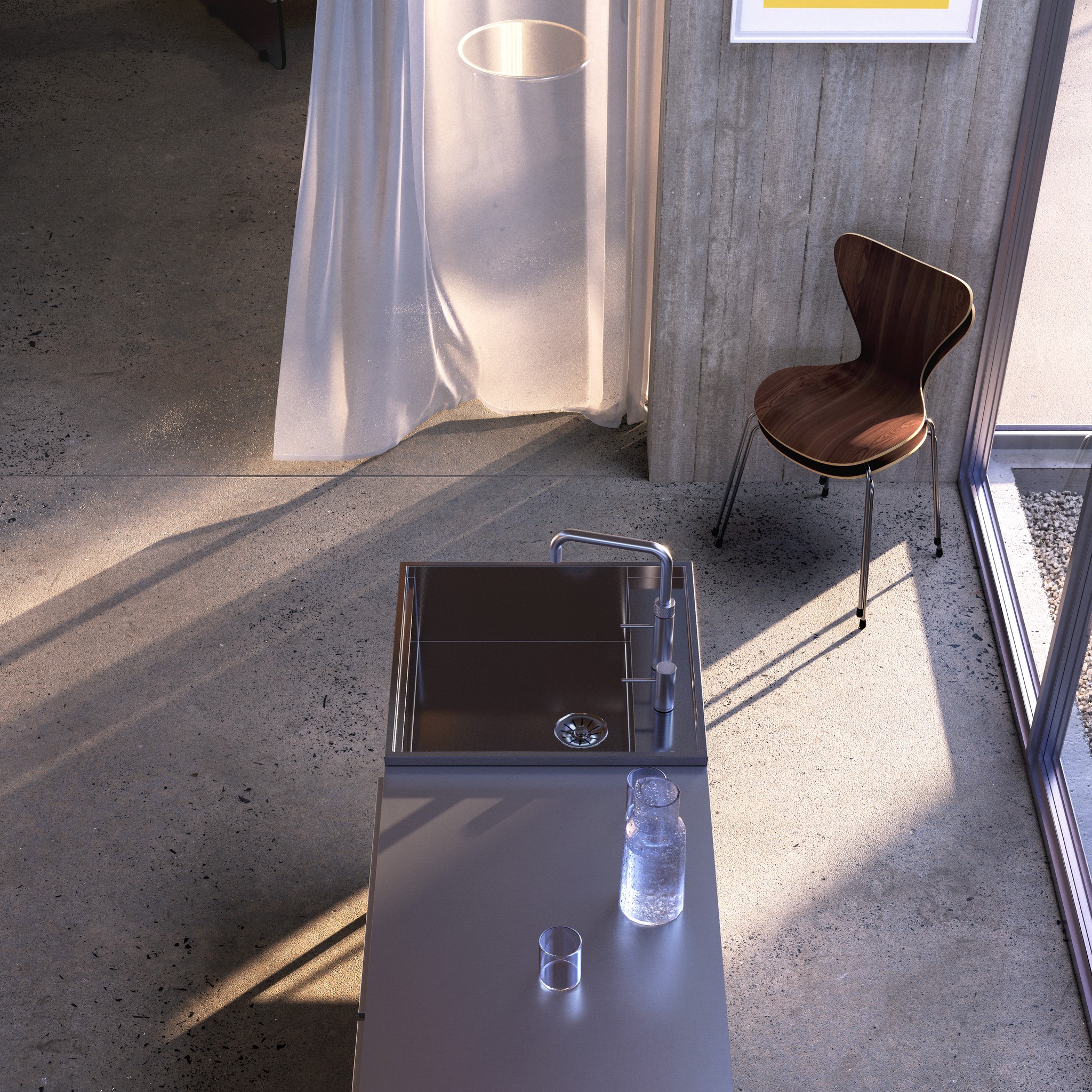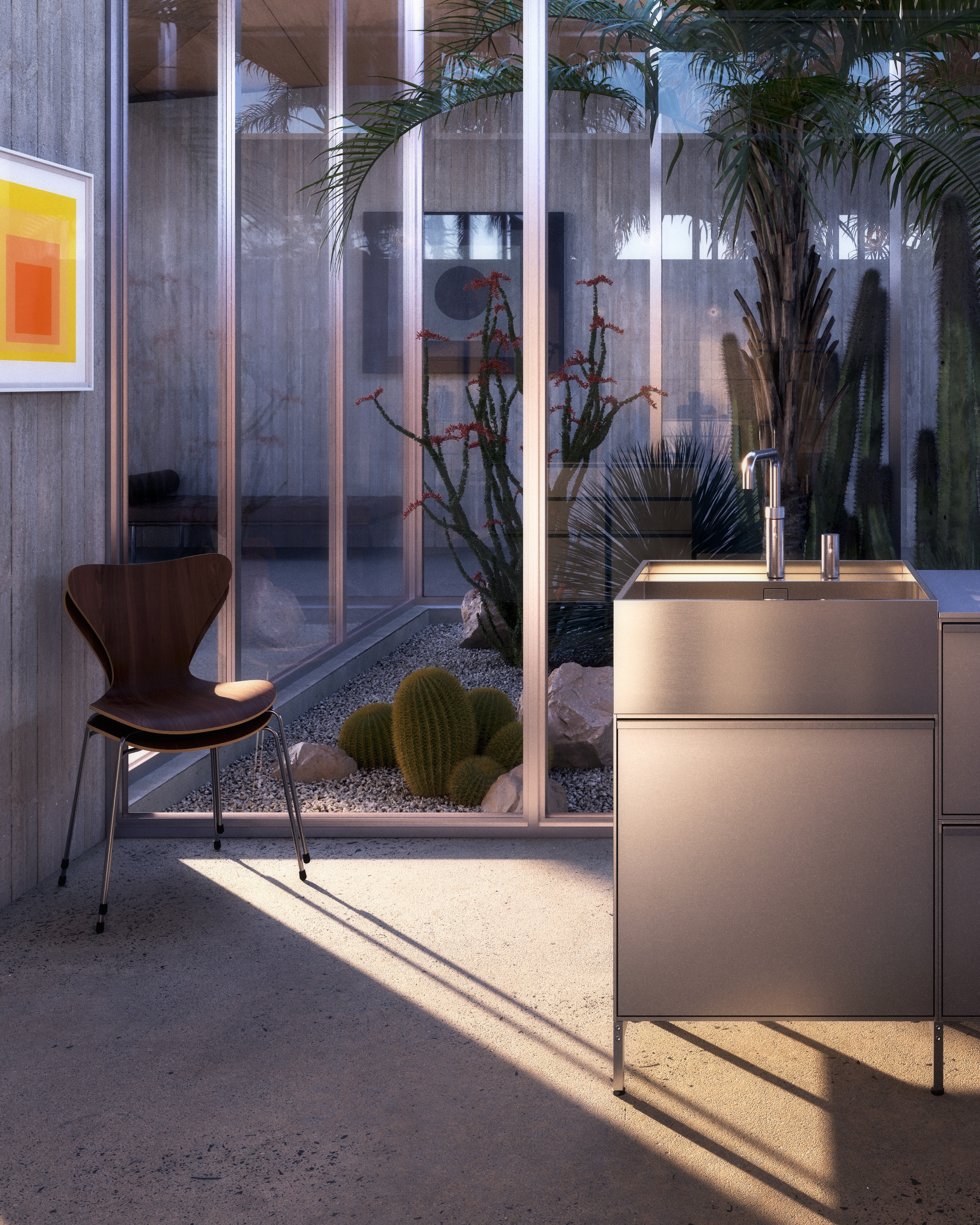 The brushed aluminium doesn't just reflect light—it modulates it, creating subtle shifts in the space's character from morning through evening. It's this quality that makes the modules architectural elements rather than just functional pieces.
