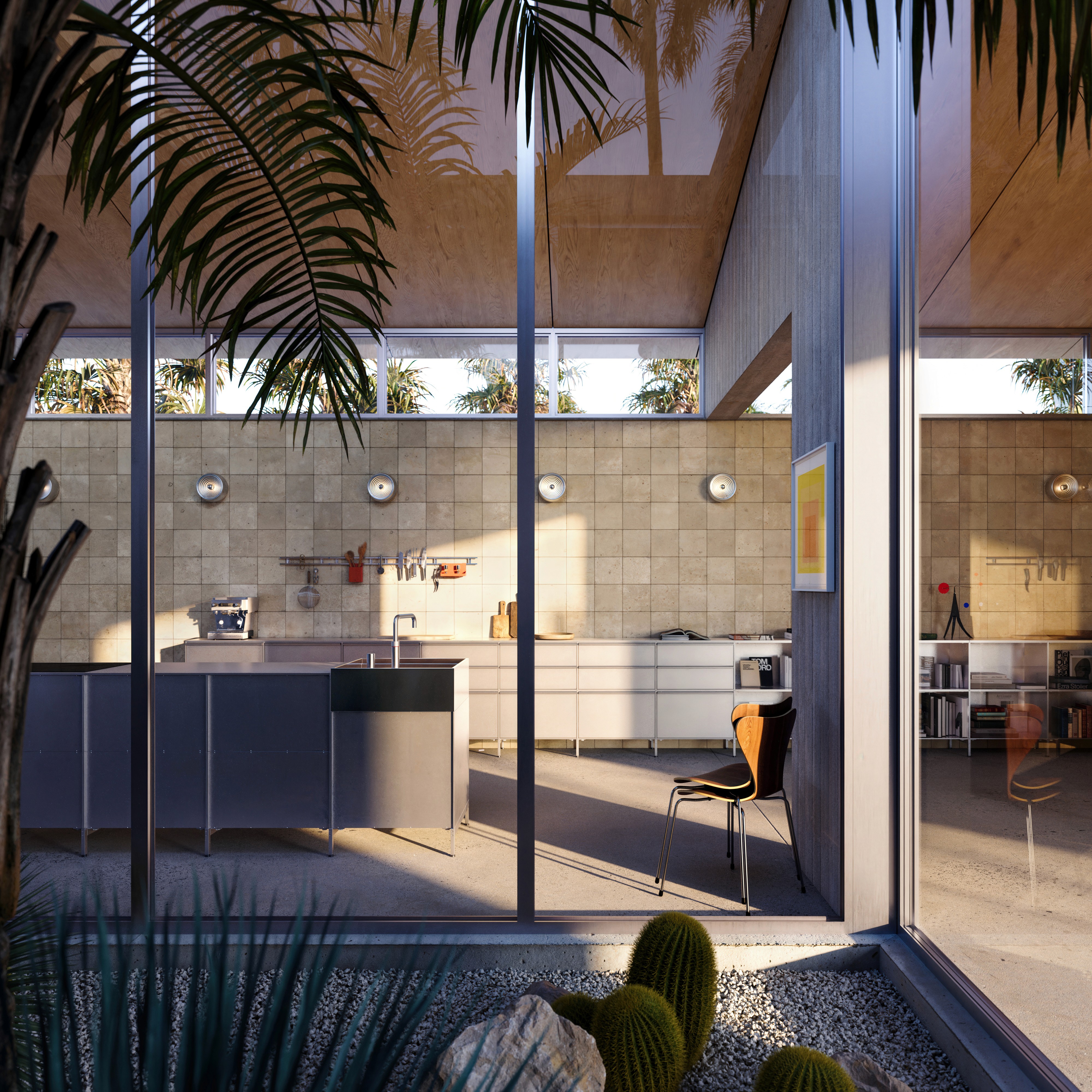"An atrium pins the surrounding structure, cradling it in return with walls of concrete and glass. Echoing the mid-century designs it references, it serves doubly as a shelter and a stage. Floor to ceiling windows blur the boundaries between inside and out, framing instead a more deliberate dialogue between the architecture and the environment."