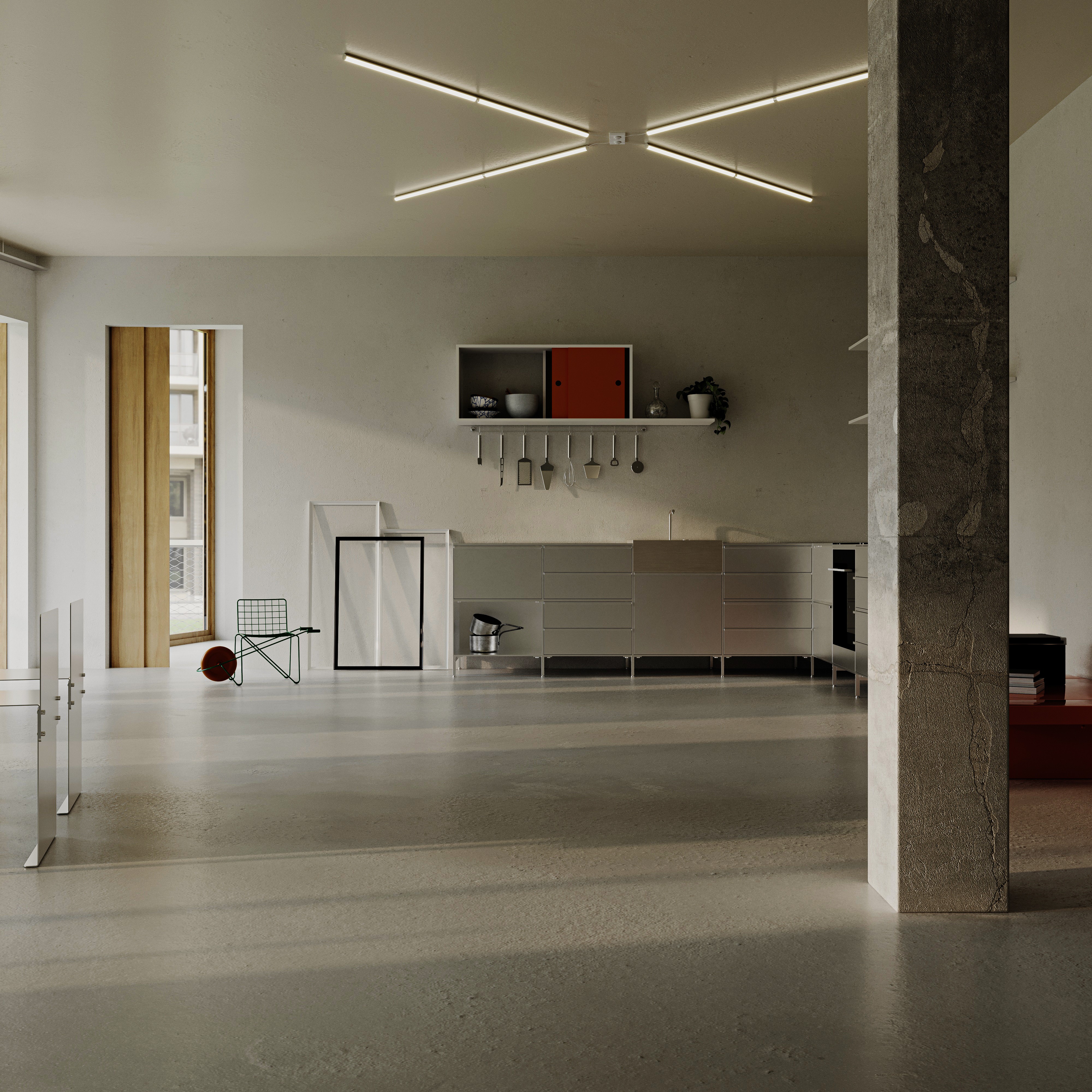 A key feature of this project is the implementation of TERMINO's kitchen module in an 'L' configuration. This is the first time TERMINO has adapted their kitchen system in this way, specifically to fit the unique corners and angles of the apartment. This 'L' system opens up the floor plan, making the kitchen and dining area more spacious and inviting, and it integrates seamlessly with the rest of the living space.