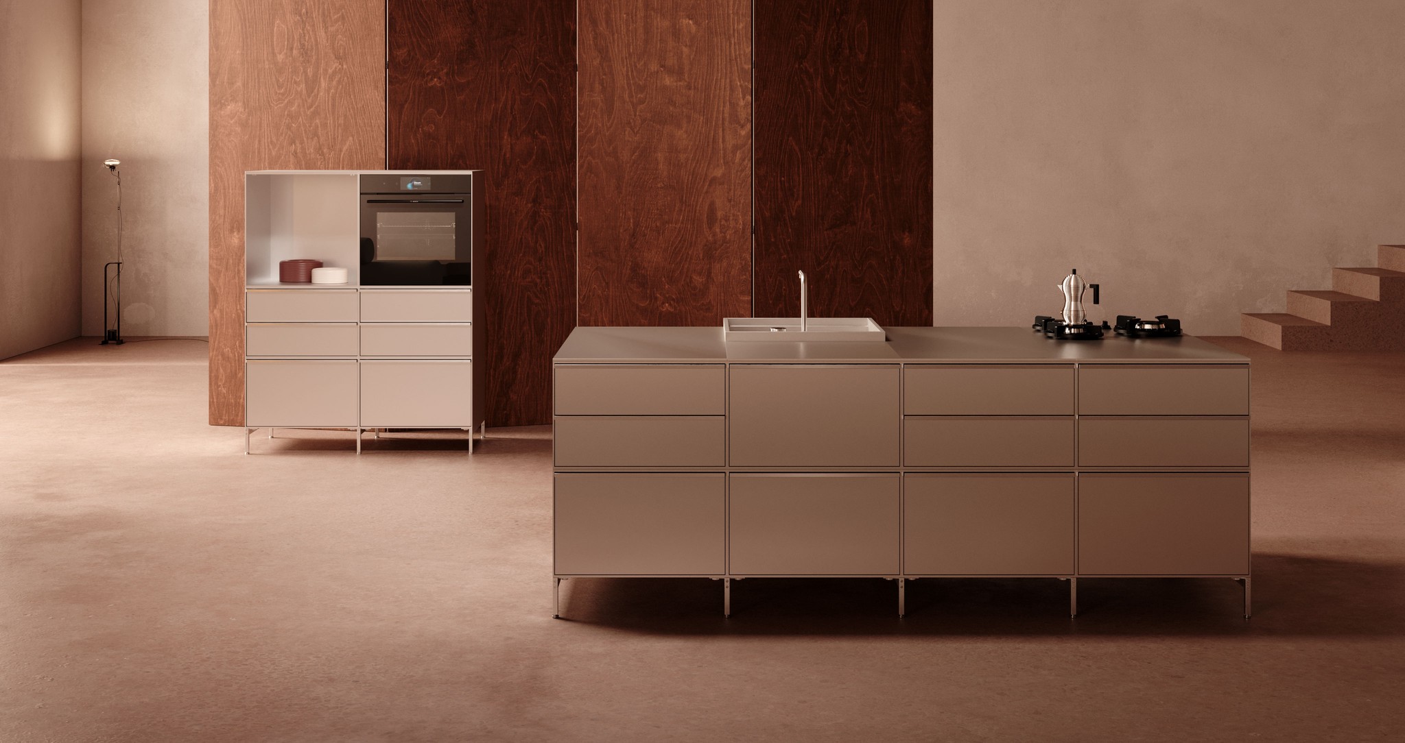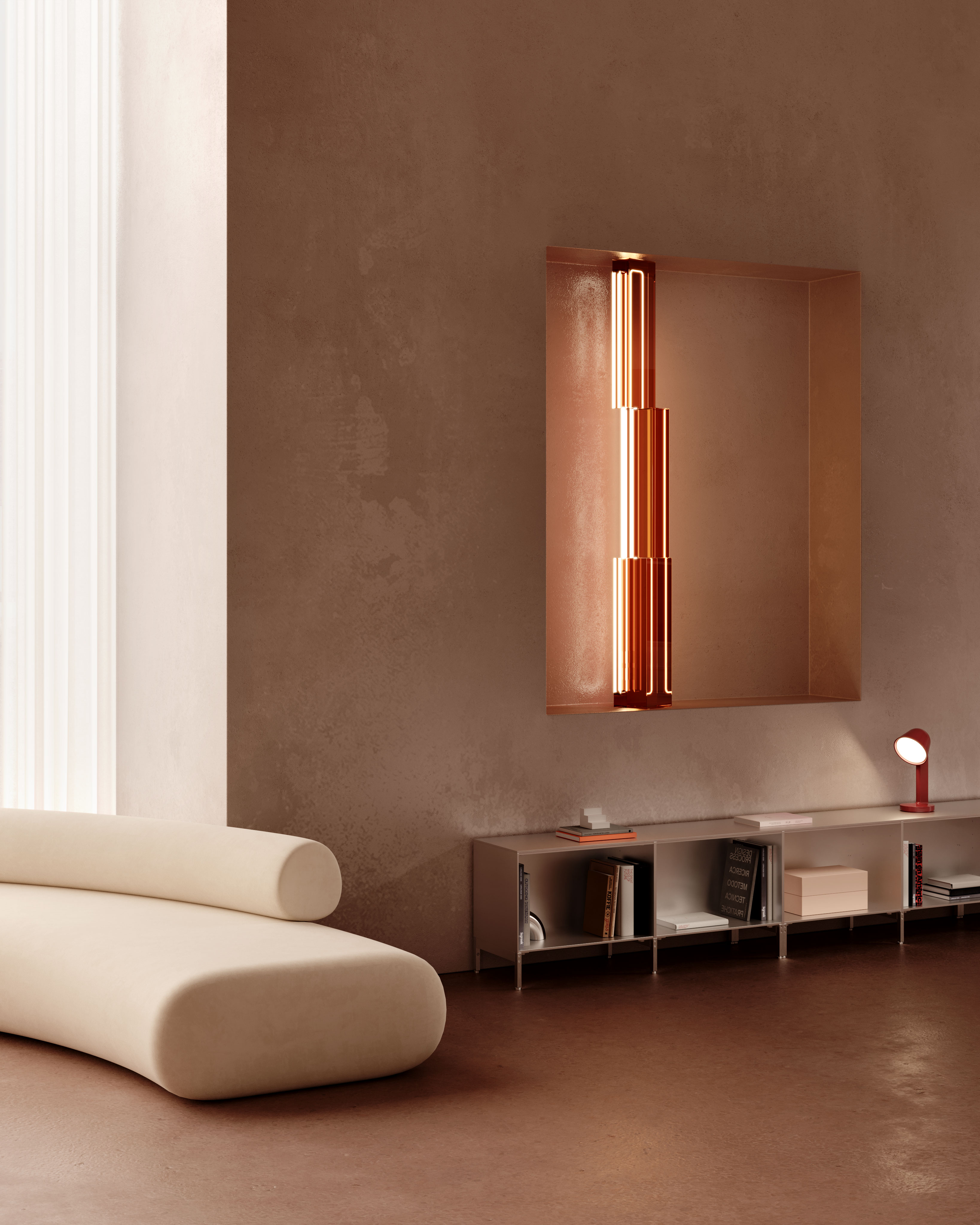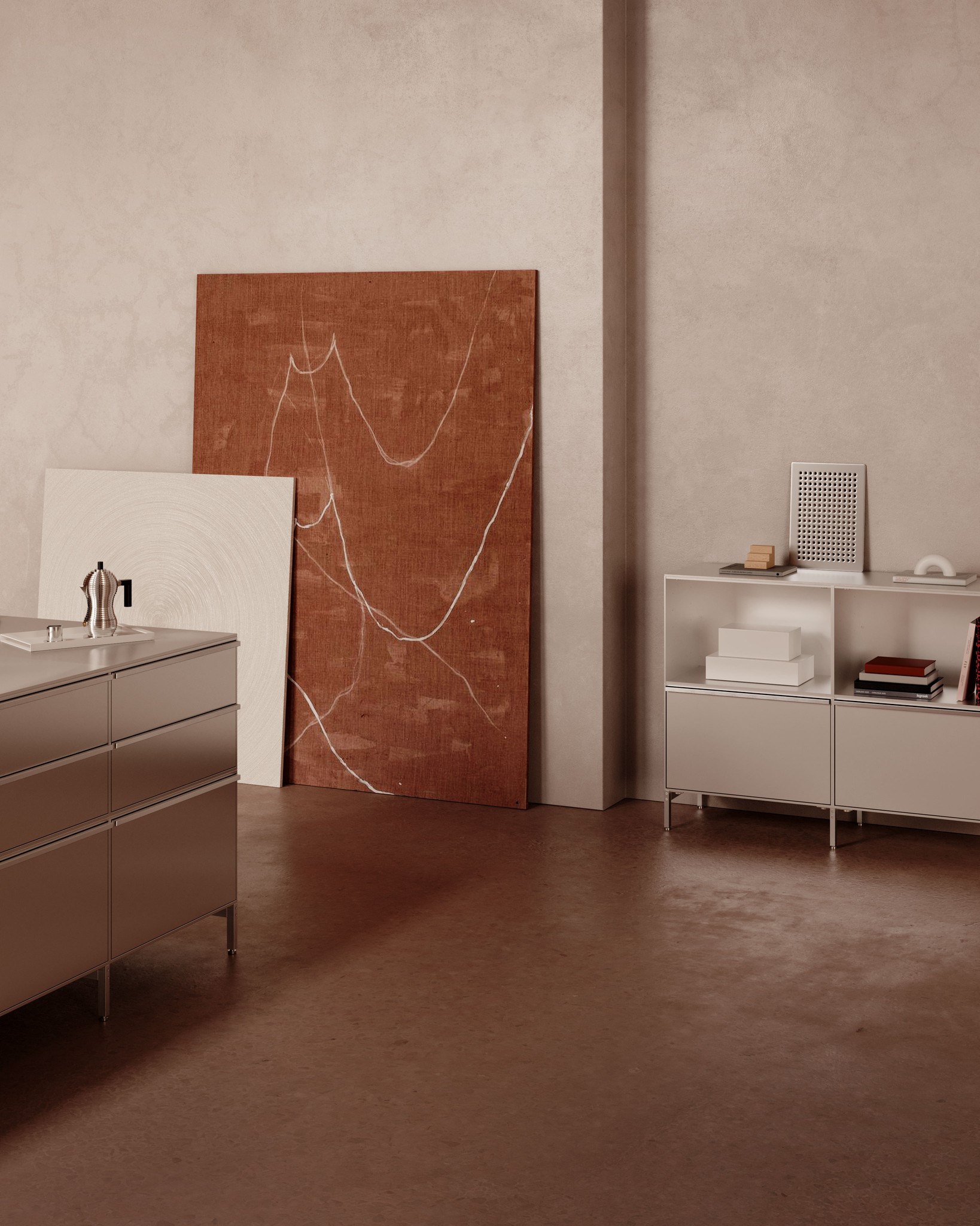 nova studio's layouts show TERMINO at its most versatile. Here, the same system operates as kitchen, storage, media console, and display. It doesn’t shout for attention—its presence is steady, infrastructural. In one frame, a single red lamp becomes a focal point not because it demands to be, but because the space allows it.