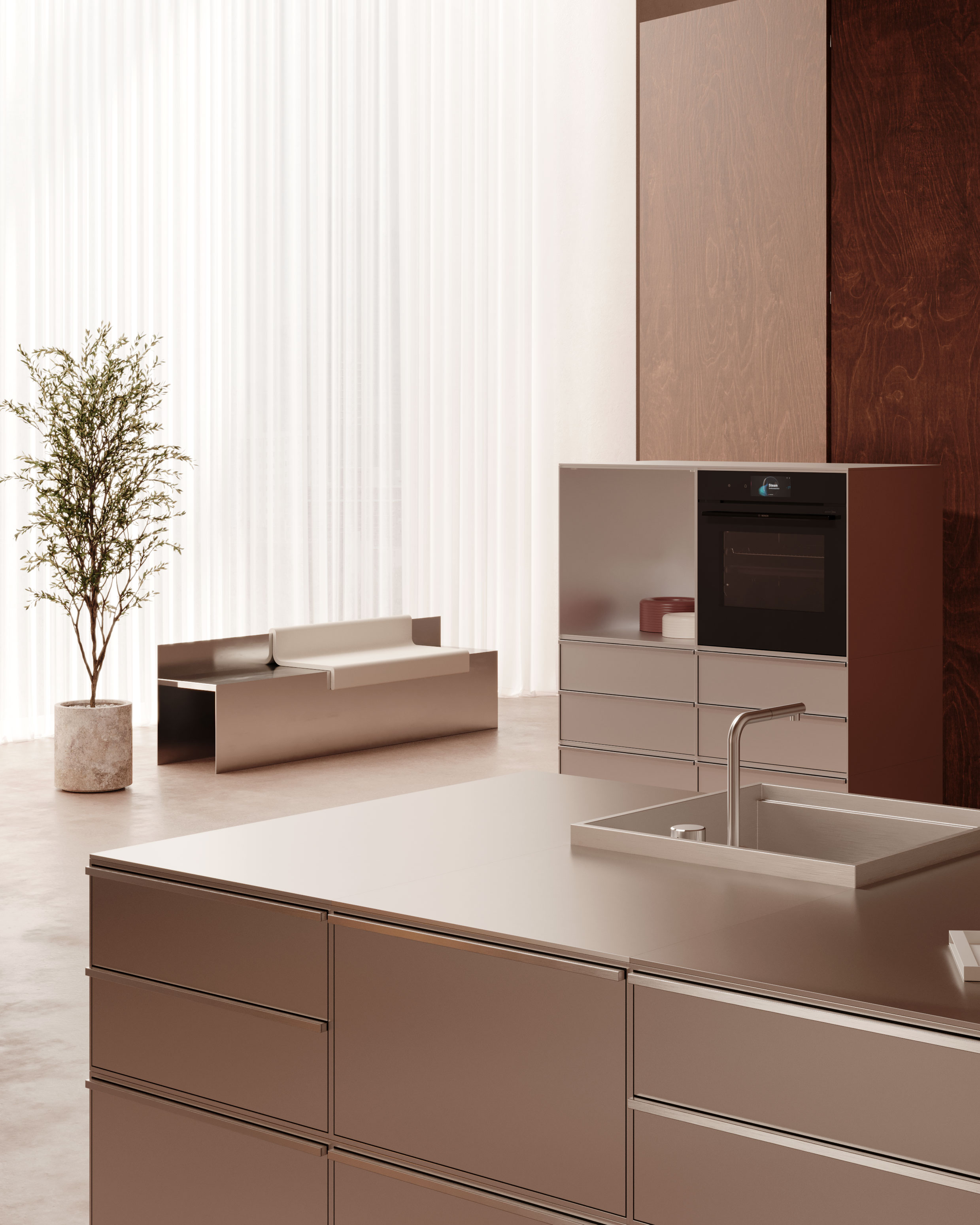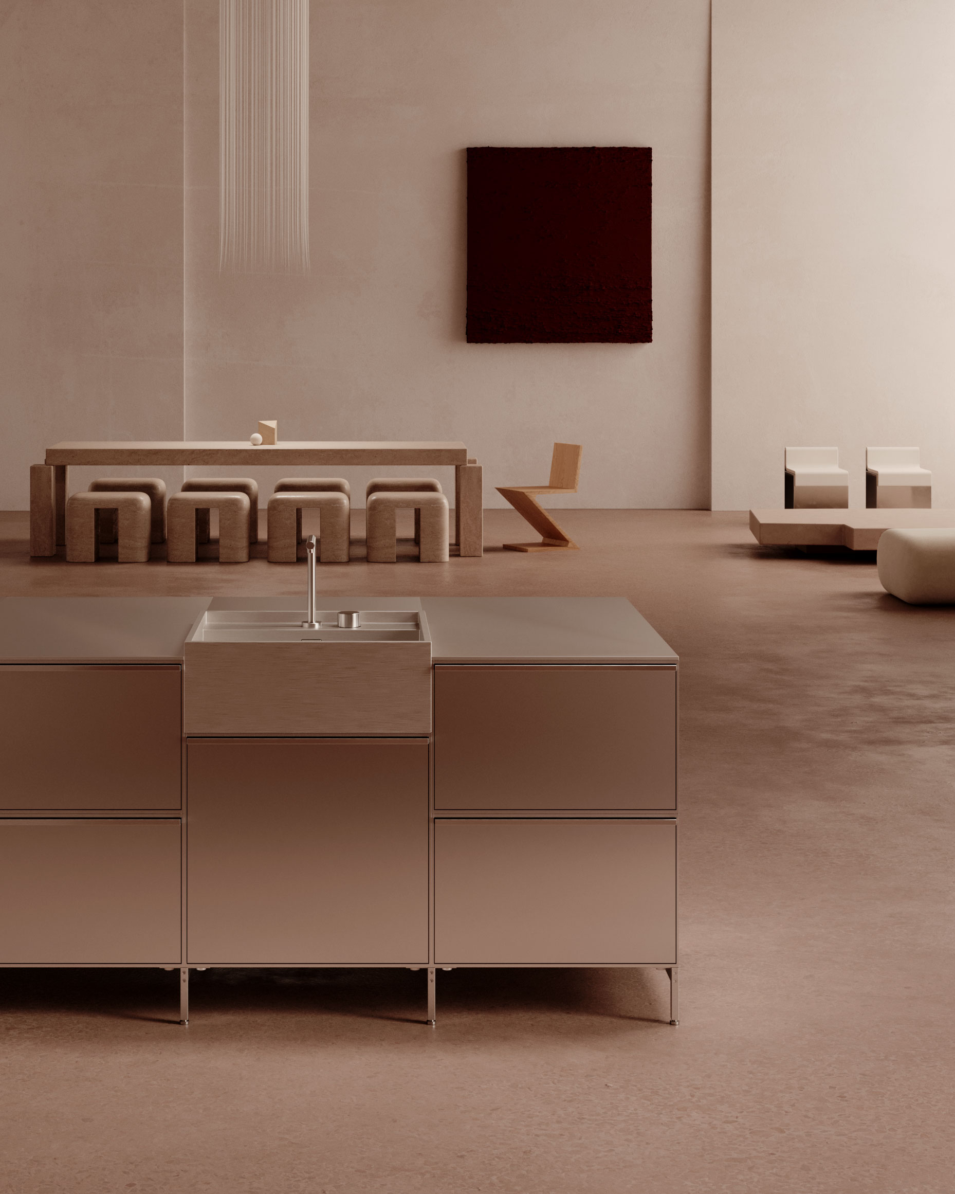 Known for his elegant, almost monastic interiors, Staniewski brings that same sensibility here—an attention to negative space, a preference for muted tones and elemental textures, and a belief that calm is something you can build. The kitchen modules, in their brushed Aluminium finish, form geometric islands that feel neither cold nor ornamental. They sit in quiet dialogue with their surroundings—anchored, but open. Walls clad in dark wood add texture and depth, gently breaking the continuity of the pale render. Light, when it enters, is treated with reverence: diffused through tall gauze curtains or captured in the gleam of a copper light fixture recessed into the wall.