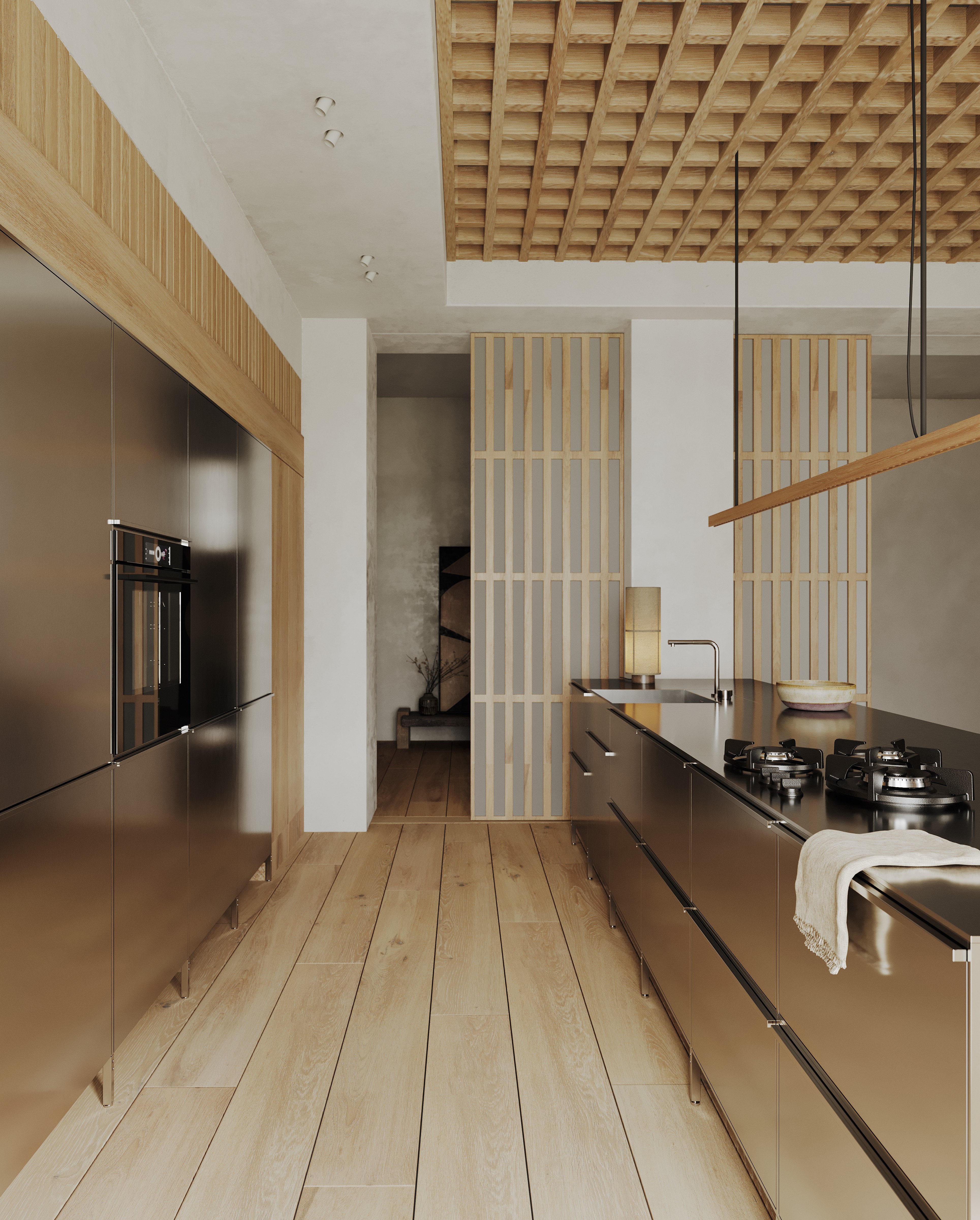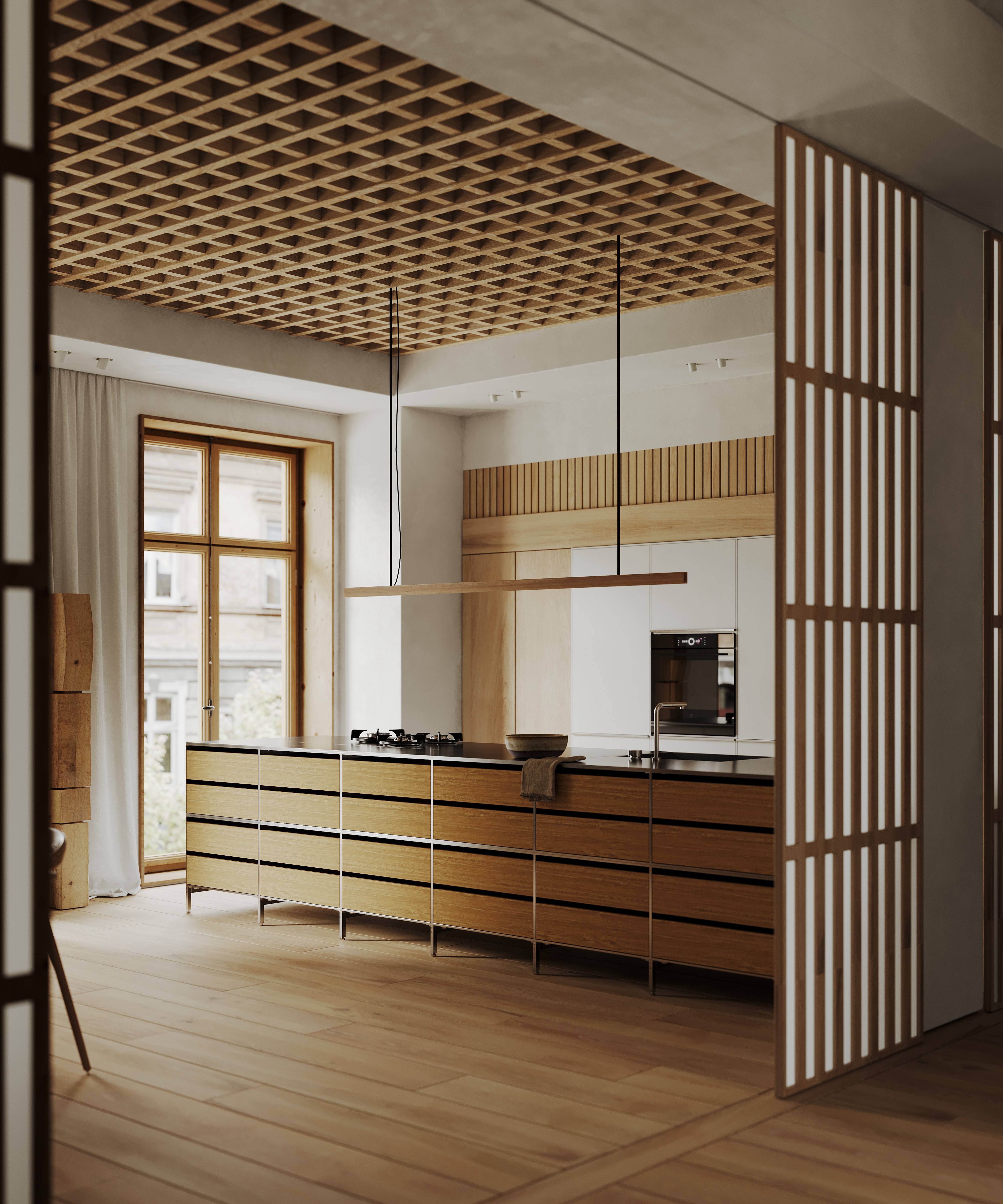 This Budapest kitchen exemplifies the potential of cross-cultural design. It combines Eastern wood use and room dividers with contemporary European elements such as open-plan layouts, minimalist design, and natural light. This harmonious fusion celebrates TERMINO’s commitment to honoring its heritage while embracing its contemporary context.