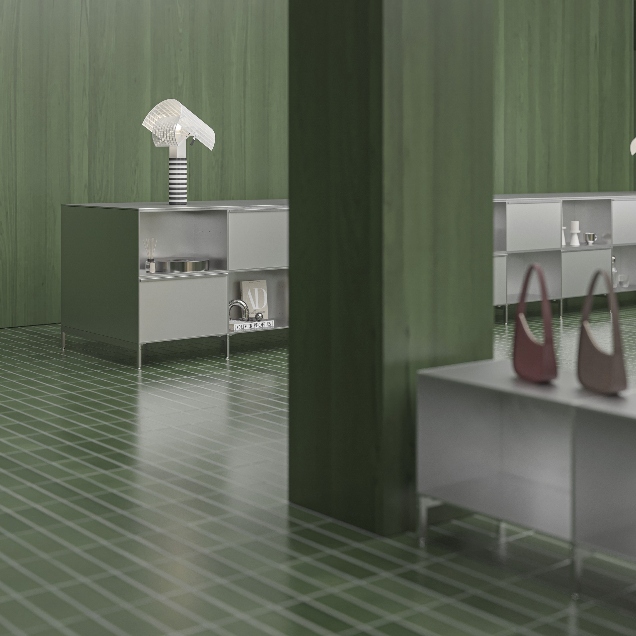 The checkerboard-patterned cash desk exemplifies the flexibility of the TERMINO system, blending open shelving and hidden drawers to balance display and storage needs. Stainless steel and recycled aluminium components harmonise with the green brick floor, creating a gleaming contemporary aesthetic.