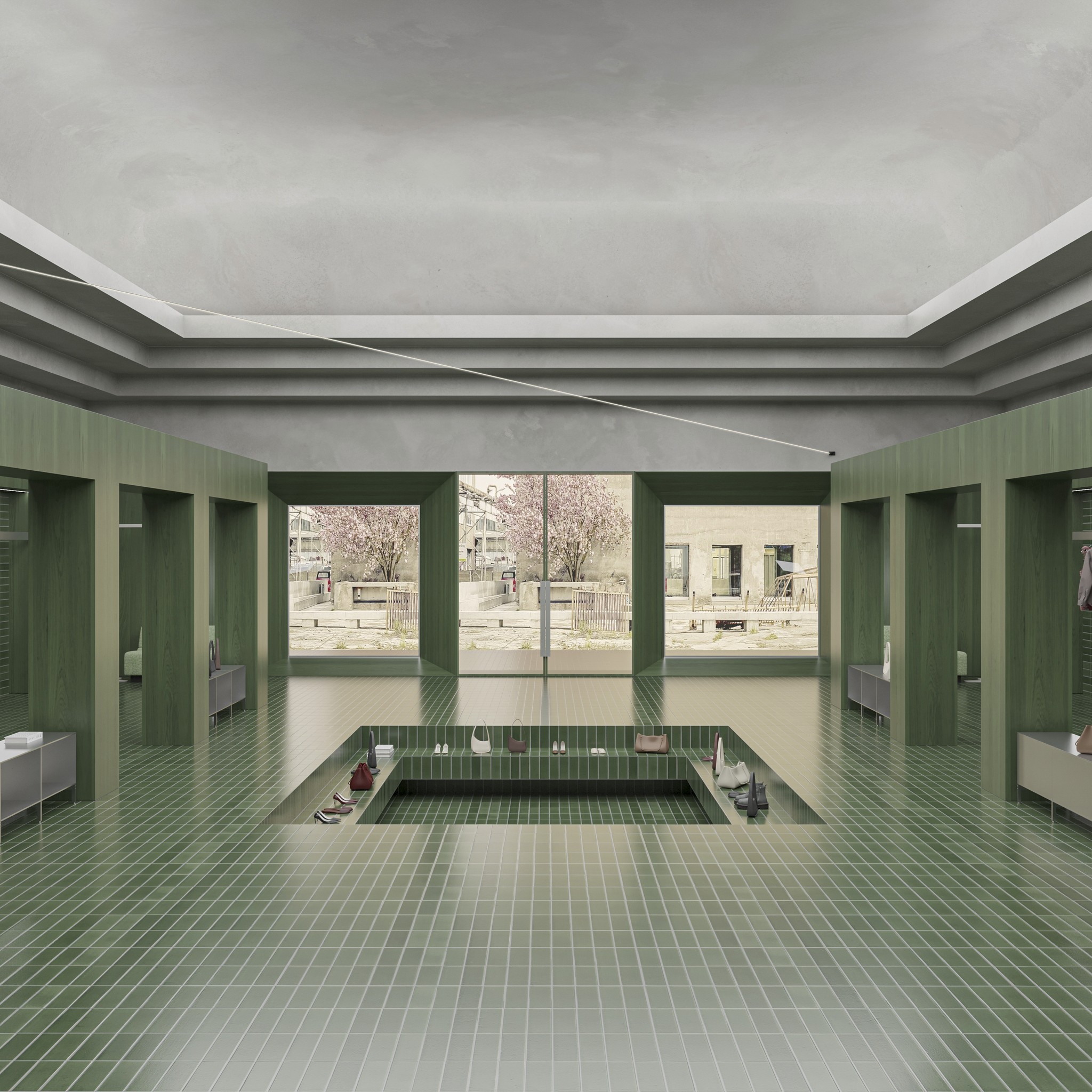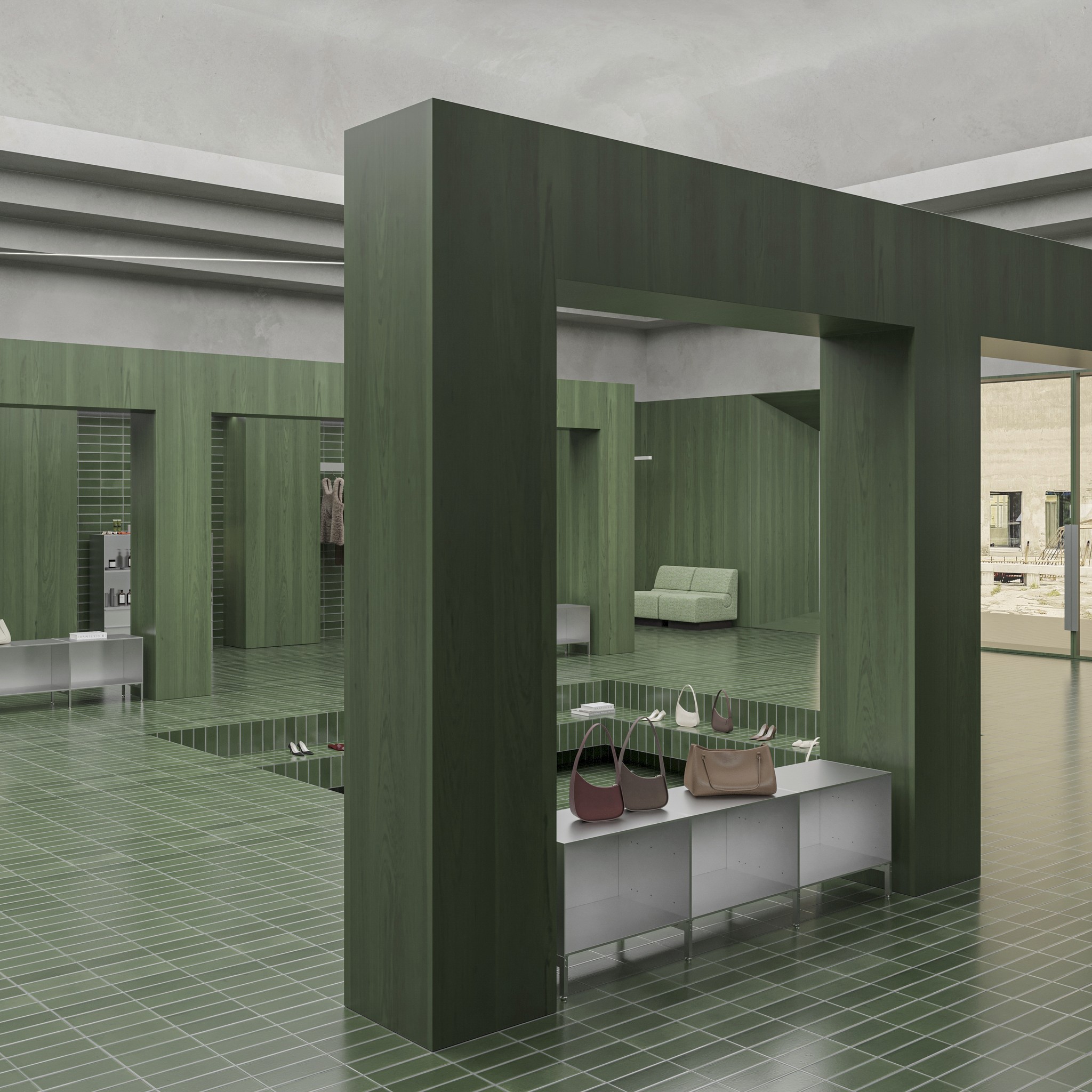 Surrounding this centrepiece, rows of multi-sectioned green-stained wood arches line the space, forming dynamic corridors that frame movement and add architectural depth. Sunken wall niches for rails and product displays further maximize utility while maintaining a clean, cohesive aesthetic.