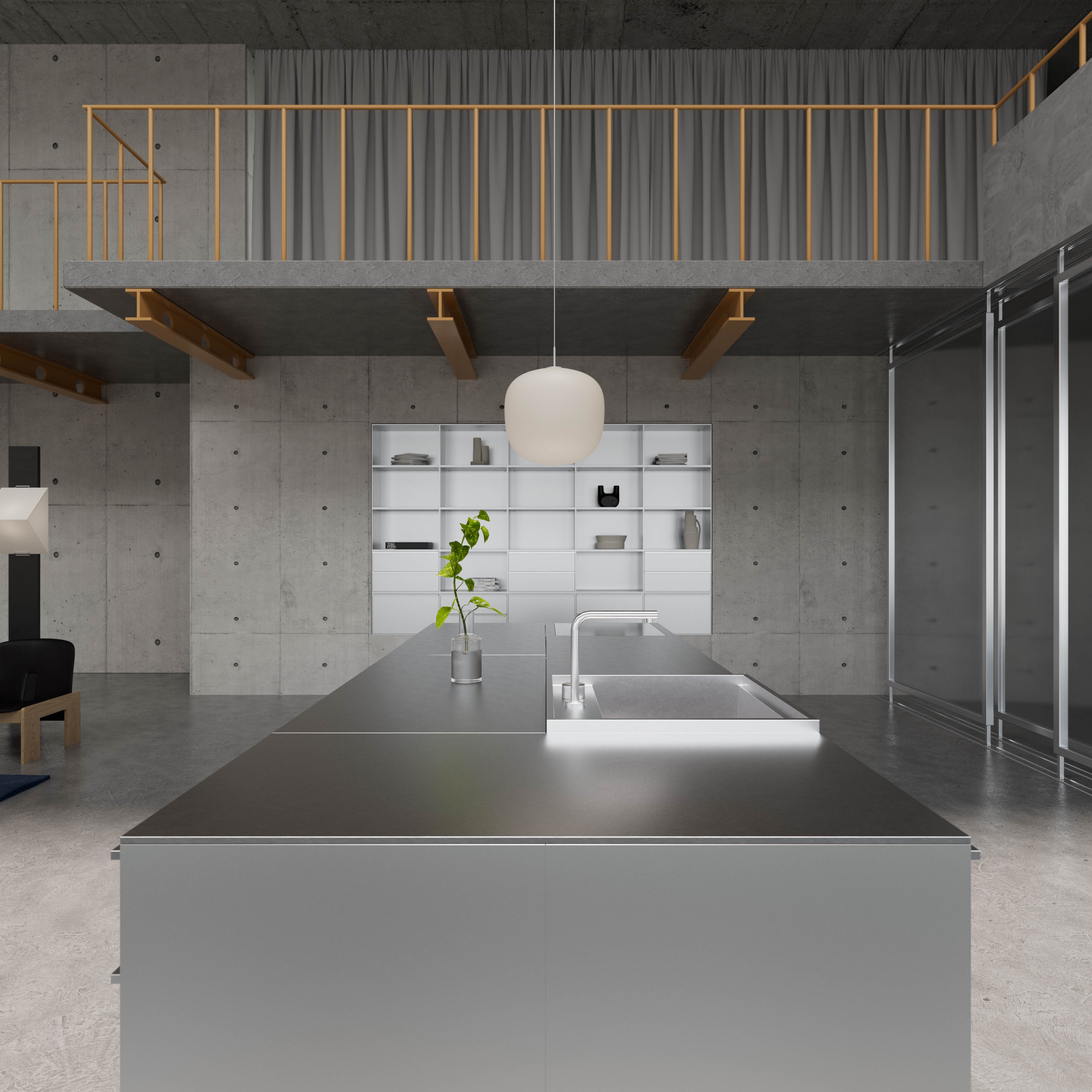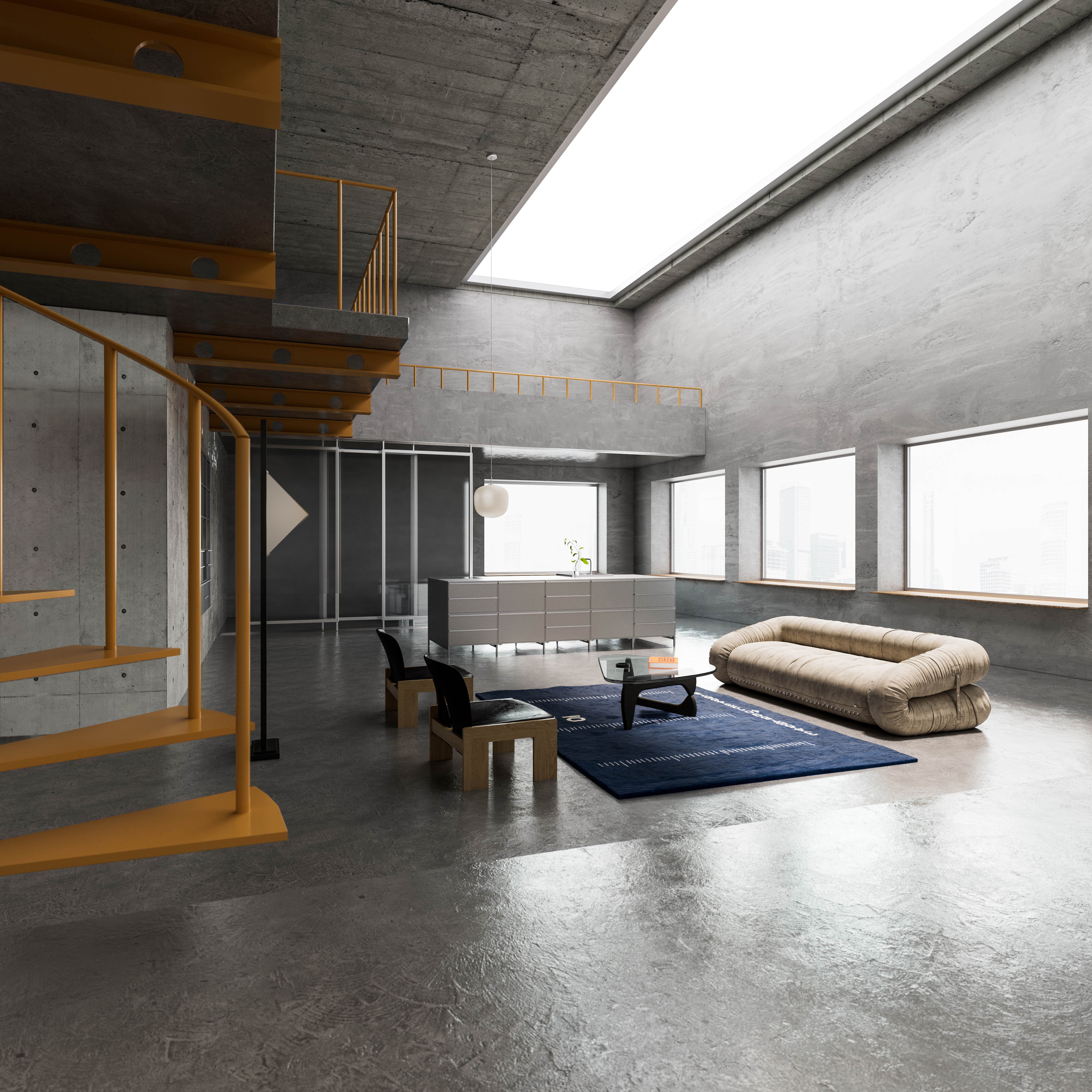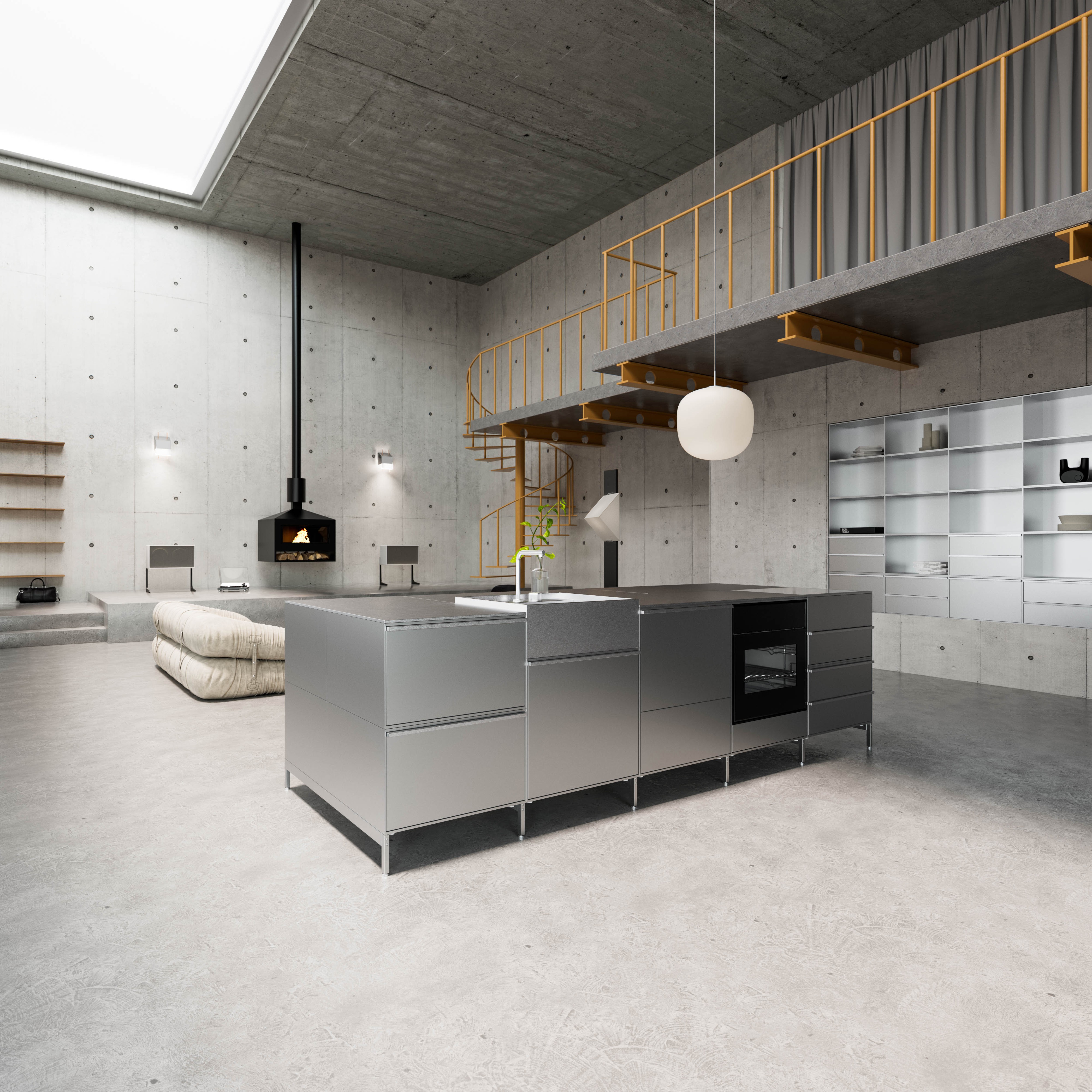 The Zweistöckige Duplex is a space perhaps defined by its paradoxes. The theoretical coldness, for example, of the raw, concrete architecture is contrasted by the large wall windows and skylight, pouring warm natural light into the space.